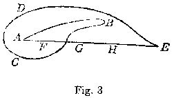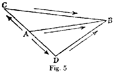 The so-called "parallelogram of forces" is simply a rule for compounding accelerations. The rule is, to represent the accelerations by paths, and then to geometrically add the paths. The geometers, however, not only use the "parallelogram of forces" to compound different accelerations, but also to resolve one acceleration into a sum of several. Let A B (Fig. 5) be the path which represents a certain acceleration -- say, such a change in the motion of a body that at the end of one second the body will, under the influence of that change, be in a position different from what it would have had if its motion had continued unchanged such that a path equivalent to A B would lead from the latter position to the former. This acceleration may be considered as the sum of the accelerations represented by A C and C B. It may also be considered as the sum of the very different accelerations represented by A D and D B, where A D is almost the opposite of A C. And it is clear that there is an immense variety of ways in which A B might be resolved into the sum of two accelerations.