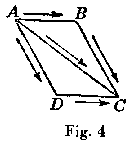 A path is a line whose beginning and end are distinguished. Two paths are considered to be equivalent, which, beginning at the same point, lead to the same point. Thus the two paths, A B C D E and A F G H E, are equivalent. Paths which do not begin at the same point are considered to be equivalent, provided that, on moving either of them without turning it, but keeping it always parallel to its original position, when its beginning coincides with that of the other path, the ends also coincide. Paths are considered as geometrically added together, when one begins where the other ends; thus the path A E is conceived to be a sum of A B, B C, C D, and D E. In the parallelogram of Fig. 4 the diagonal A C is the sum of A B and B C; or, since A D is geometrically equivalent to B C, A C is the geometrical sum of A B and A D.